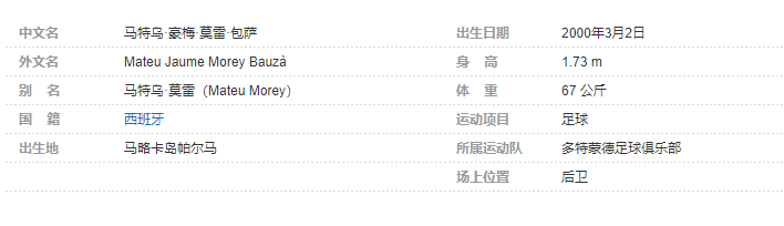 马特乌·莫雷(Mateu Morey),全名马特乌·豪梅·莫雷·包萨(Mateu Jaume Morey Bauzà)2000年3月2日出生于西班牙马略卡岛首府帕尔马,是一名西班牙职业足球运动员,场上司职后卫,现在效力于德国足球甲级联赛的多特蒙德足球俱乐部。