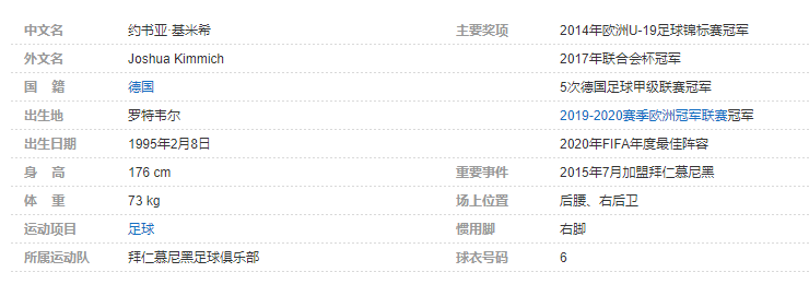 约书亚·基米希(Joshua Kimmich),1995年2月8日出生于德国罗特韦尔,德国足球运动员,场上司职后腰/右后卫,现效力于德国足球甲级联赛的拜仁慕尼黑足球俱乐部。