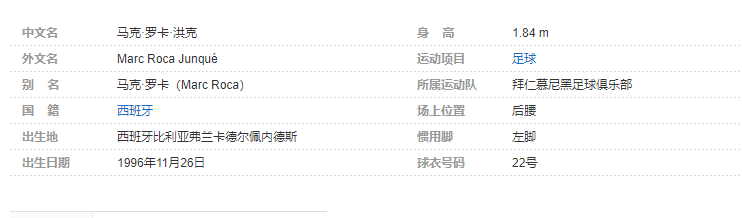 马克·罗卡(Marc Roca),全名马克·罗卡·洪克(Marc Roca Junqué),1996年11月26日出生于西班牙比利亚弗兰卡德尔佩内德斯,西班牙足球运动员,司职后腰,效力于德国足球甲级联赛的拜仁慕尼黑足球俱乐部。