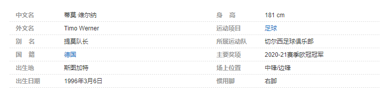蒂莫·维尔纳(Timo Werner),1996年3月6日出生于德国斯图加特,德国男子职业足球运动员,司职中锋,亦可胜任边锋,效力于英超切尔西足球俱乐部。