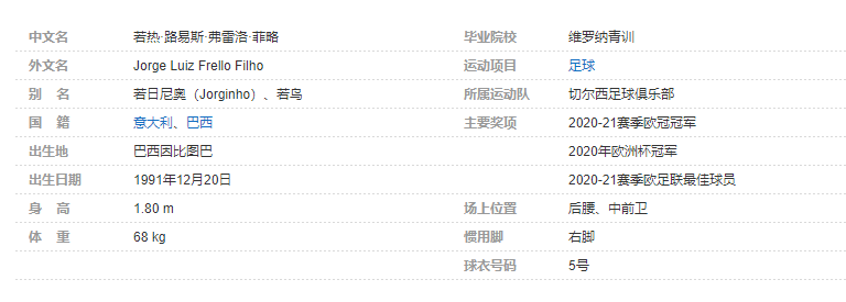 若日尼奥(Jorginho),全名若热·路易斯·弗雷洛·菲略(Jorge Luiz Frello Filho),1991年12月20日出生于巴西因比图巴,意大利足球运动员,司职后腰,现效力于英格兰足球超级联赛的切尔西足球俱乐部 。
