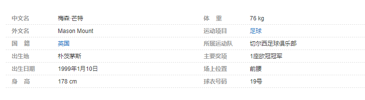 梅森·芒特(Mason Mount),1999年1月10日出生于英国朴茨茅斯市,英格兰职业足球运动员,场上司职前腰,现效力于英格兰足球超级联赛的切尔西足球俱乐部 。