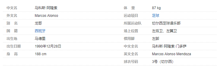 马科斯·阿隆索(Marcos Alonso),1990年12月28日出生于西班牙马德里,西班牙足球运动员,场上司职左后卫、左翼卫,效力于英超切尔西足球俱乐部 。