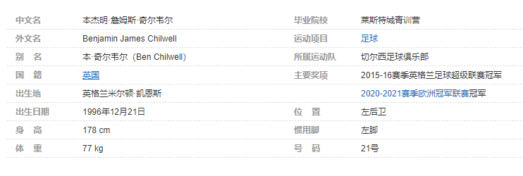 本·奇尔韦尔(Ben Chilwell),全名本杰明·詹姆斯·奇尔韦尔(Benjamin James Chilwell),1996年12月21日出生于英格兰米尔顿·凯恩斯,英格兰足球运动员,司职左后卫,现效力于英格兰足球超级联赛的切尔西足球俱乐部。