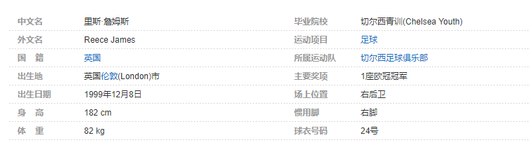里斯·詹姆斯(Reece James),1999年12月8日出生于英国伦敦,英格兰足球运动员,司职后卫,现效力于切尔西足球俱乐部。