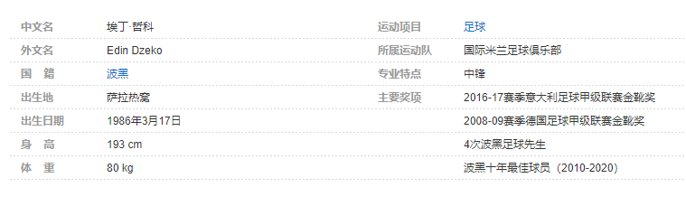 哲科个人详细资料简介埃丁·哲科(Edin Dzeko),1986年3月17日出生于波黑的萨拉热窝,波黑职业足球运动员,场上司职前锋,现效力于国际米兰足球俱乐部。 个人简介