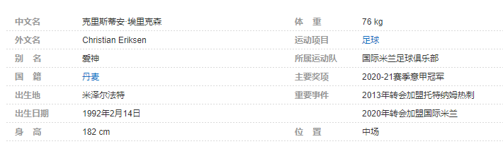 克里斯蒂安·埃里克森(Christian Eriksen),1992年2月14日出生于丹麦米泽尔法特,丹麦足球运动员,场上司职中场,效力于意甲国际米兰足球俱乐部 。