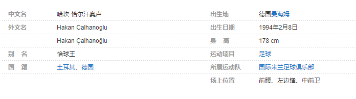 哈坎·恰尔汗奥卢(Hakan Çalhanoğlu),1994年2月8日出生于德国曼海姆市,土耳其足球运动员,司职前腰,亦可胜任左边锋、中前卫,现效力于国际米兰足球俱乐部。