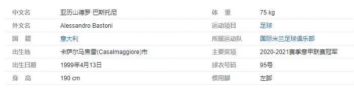 亚历山德罗·巴斯托尼(Alessandro Bastoni),1999年4月13日出生于意大利卡萨尔马焦雷(Casalmaggiore)市,意大利足球运动员,司职后卫,现效力于国际米兰足球俱乐部。 [1] 2020-21赛季,巴斯托尼帮助国际米兰夺得意甲冠军。