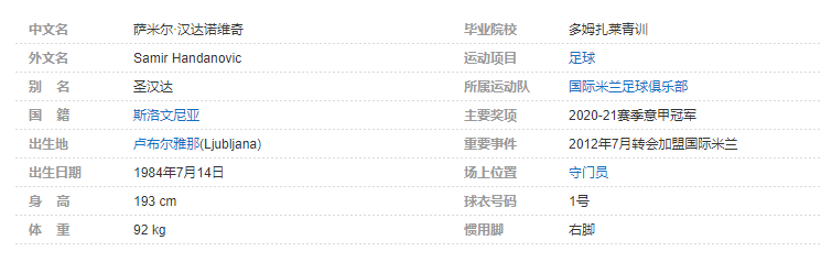 萨米尔·汉达诺维奇(Samir Handanovic),1984年7月14日出生于前南斯拉夫卢布尔雅那,斯洛文尼亚职业足球运动员,场上司职守门员,现效力于国际米兰足球俱乐部,亦担任球队队长。