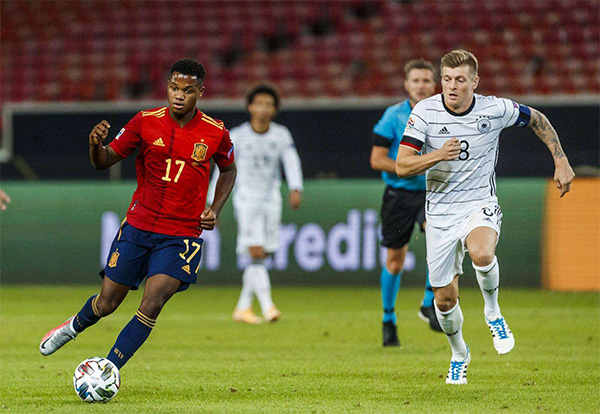2020年9月3日,欧国联A级第4组第1轮,西班牙客场1-1战平德国,法蒂在下半场开场前替补登场换下纳瓦斯,上演西班牙国家队首秀。 [9] 9月6日,在西班牙主场与乌克兰的欧国联比赛中,法蒂收获了其西班牙国家队处子球,法蒂同时成为了西班牙国家队史上最年轻的进球者。