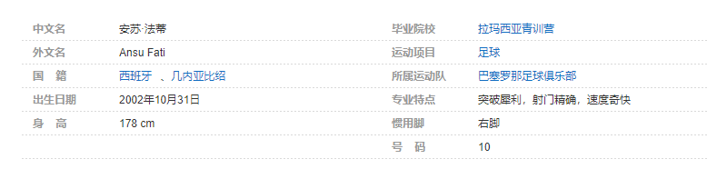 安苏·法蒂(Ansu Fati),全名安苏曼·法蒂·维埃拉(Anssumane Fati Vieira)2002年10月31日出生于几内亚比绍,西班牙足球运动员,司职前锋,现效力于西班牙足球甲级联赛的巴塞罗那足球俱乐部。