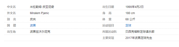 米拉勒姆·皮亚尼奇(Miralem Pjanic),1990年4月2日出生于波黑兹沃尔尼克,波黑职业足球运动员,司职攻击型中场,现效力于土耳其的贝西克塔斯足球俱乐部 。
