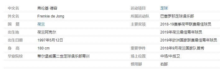 弗伦基·德容(Frenkie de Jong),1997年5月12日出生于荷兰阿克尔,荷兰男子职业足球运动员,场上司职中场/中后卫,效力于西甲巴塞罗那足球俱乐部。