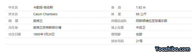 卡勒姆·钱伯斯(Calum Chambers)(Calum的英语发音译名是卡勒姆),1995年1月20日出生于英格兰皮特斯菲尔德,英格兰足球运动员,司职中后卫,效力于英格兰足球超级联赛的阿斯顿维拉俱乐部。