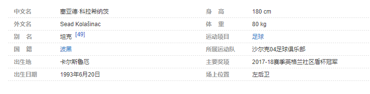 塞亚德·科拉希纳茨(Sead Kolasinac),1993年6月20日出生于德国卡尔斯鲁厄,波斯尼亚和黑塞哥维那籍职业足球运动员,场上司职为左后卫,现效力于德国足球甲级联赛的沙尔克04足球俱乐部 。