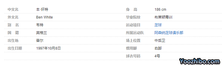 本·怀特(Ben White),全名本杰明·威廉·怀特(Benjamin William White),1997年10月8日出生于英国普尔,英格兰足球运动员,场上司职中后卫,现效力于英超的阿森纳足球俱乐部。