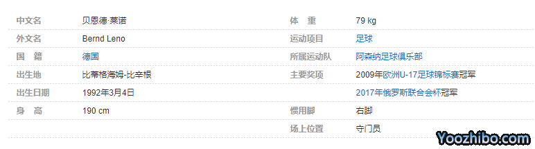 贝恩德·莱诺(Bernd Leno),1992年3月4日出生于德国比蒂格海姆-比辛根,德国职业足球运动员,场上司职门将,效力于英格兰足球超级联赛的阿森纳足球俱乐部。