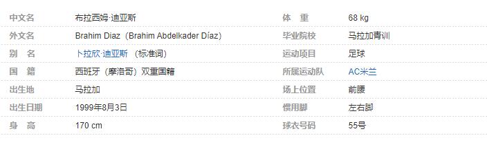 布拉西姆·迪亚斯(Brahim Diaz),全名:布拉西姆·阿卜杜勒卡德尔·迪亚斯(Brahim Abdelkader Díaz),1999年8月3日出生于西班牙马拉加,西班牙足球运动员,场上司职前腰或者边前卫,现效力于意甲的AC米兰足球俱乐部。