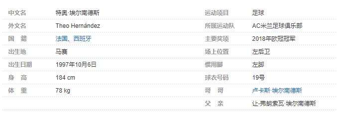 特奥·埃尔南德斯(Theo Hernández),1997年10月6日出生于法国马赛,法国足球运动员,场上司职左后卫,现效力于意大利足球甲级联赛的AC米兰足球俱乐部。