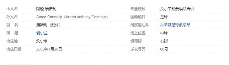 阿隆·康诺利(Aaron Connolly),全名:阿隆·安东尼·康诺利(Aaron Anthony Connolly),2000年1月28日出生于爱尔兰,爱尔兰足球运动员,场上司职中锋,现效力