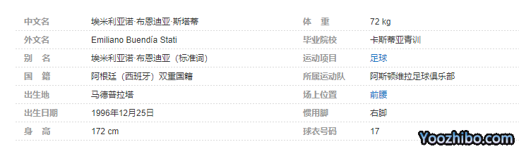 埃米利亚诺·布恩迪亚·斯塔蒂(Emiliano Buendía Stati),1996年12月25日出生于马德普拉塔,阿根廷职业足球运动员,场上司职前腰、边锋,现效力于阿斯顿维拉足球俱乐部。