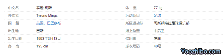 泰隆·明斯(Tyrone Mings),1993年3月13日出生于英格兰巴斯,英格兰足球运动员,场上司职中后卫,现效力于英格兰足球超级联赛的阿斯顿维拉足球俱乐部,亦担任球队队长。