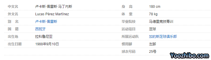 卢卡斯·佩雷斯·马丁内斯(Lucas Pérez Martínez),简称:卢卡斯·佩雷斯(Lucas Pérez),1988年9月10日出生于西班牙的拉科鲁尼亚,西班牙足球运动员,场上司职前锋,现效力于西班牙足球甲级联赛的加的斯足球俱乐部。