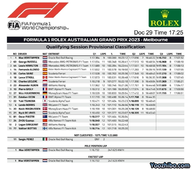 24直播网讯 北京时间04月01日,2023年F1澳大利亚大奖赛排位赛在墨尔本赛道结束,红牛车队维斯塔潘拿到杆位,梅赛德斯车队拉塞尔和汉密尔顿二三名。阿斯顿马丁车队阿隆索第四。