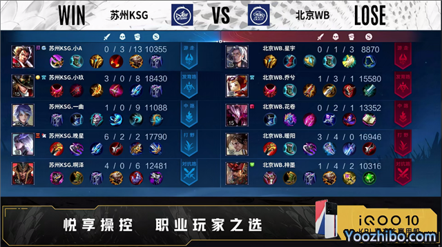 第一局双方常规开局。3分30秒苏州KSG对抗路击杀关羽拿下一血。4分01秒苏州KSG摧毁敌方对抗路外塔。5分16秒北京WB拿下暴君。5分35秒中路团苏州KSG打出0换2,随后摧毁敌方中路外塔。7分17秒北京WB摧毁敌方发育路外塔。7分50秒苏州KSG野区击杀铠。8分02秒苏州KSG摧毁敌方发育路二塔。8分37秒苏州KSG拿下先知主宰。9分30秒野区团苏州KSG击杀铠。10分27秒苏州KSG拿下暗影主宰。11分34秒苏州KSG摧毁敌方中路二塔。11分58秒苏州KSG摧毁敌方发育路高地塔。12分22秒苏州KSG拿下暗影暴君。13分02秒苏州KSG告破敌方三路外塔。13分25秒对抗路团苏州KSG打出0换5团灭对手。14分02秒苏州KSG摧毁敌方水晶拿下比赛。
