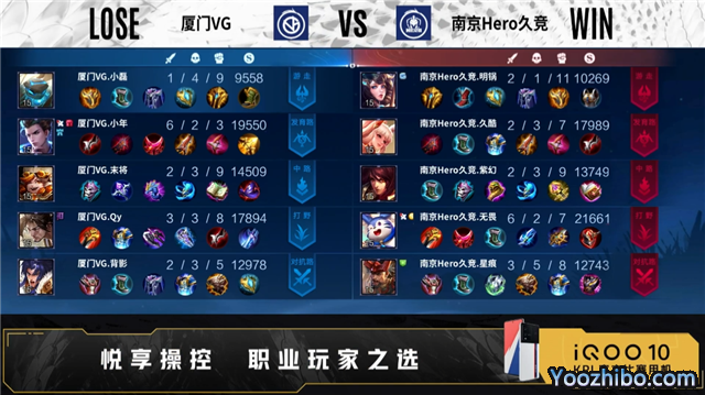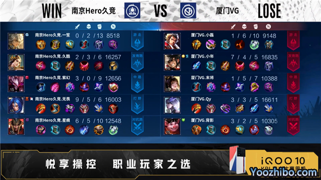 开局双方正常抢线。2分35秒野区厦门VG击杀娜可露露,拿下一血。4分12秒南京Hero久竞拿下暴君,5分07秒南京Hero久竞摧毁敌方发育路外塔。6分18秒中路南京Hero久竞击杀阿古朵,拿下主宰,摧毁敌方中路外塔。7分16秒厦门VG摧毁敌方发育路外塔,河道南京Hero久竞击杀不知火舞,打出1换4。8分47秒野区南京Hero久竞击杀不知火舞,打出1换3,摧毁敌方对抗路二塔。10分10秒南京Hero久竞拿下暗影暴君,野区击杀鬼谷子,打出1换2,拿下暗影主宰。12分03秒对抗路南京Hero久竞击杀鬼谷子,摧毁敌方对抗路高地、中路二塔、高地、发育路二塔。13分32秒南京Hero久竞摧毁敌方发育路高地,李元芳二连击破,打出1换5,团灭对手摧毁水晶拿下比赛。