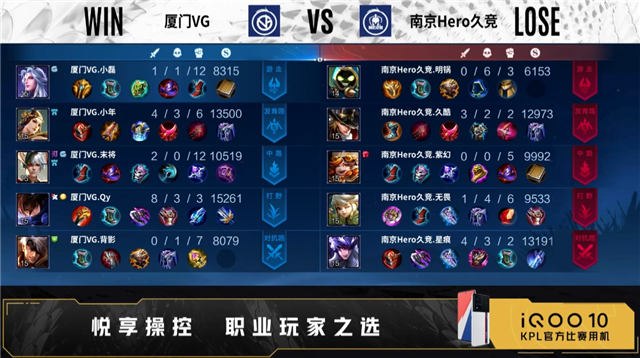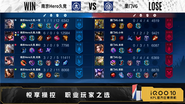 开局双方正常抢线。1分07秒河道南京Hero久竞击杀张飞,拿下一血,蒙恬二连击破,打出0换2。2分11秒厦门VG拿下暴君,3分51秒南京Hero久竞拿下主宰。4分06秒河道厦门VG击杀蒙恬,打出0换1。5分42秒野区厦门VG击杀虞姬,蒙犽二连击破,打出1换2。6分55秒厦门VG摧毁敌方发育路外塔,击杀蒙恬,摧毁敌方发育路二塔、对抗路外塔。8分35秒对抗路南京Hero久竞击杀上官婉儿,干将莫邪二连击破,打出1换4,摧毁敌方中路外塔。10分21秒南京Hero久竞拿下暗影暴君,厦门VG拿下暗影主宰。10分43秒野区南京Hero久竞击杀张飞,摧毁敌方对抗路外塔。12分33秒野区南京Hero久竞击杀镜,橘右京二连击破,厦门VG猪八戒二连击破,双方打出2换2,南京Hero久竞摧毁敌方对抗路二塔。13分45秒厦门VG击杀橘右京,双方打出2换2。15分17秒河道厦门VG镜二连击破,打出1换2,拿下暗影暴君。16分17秒中路厦门VG击杀蒙恬,拿下暗影主宰,南京Hero久竞击杀上官婉儿,打出1换1。18分58秒野区厦门VG击杀蒙恬。21分18秒中路厦门VG击杀虞姬,摧毁敌方中路二塔,南京Hero久竞橘右京三连决胜,打出1换5,摧毁敌方对抗路高地、中路高地,摧毁水晶拿下比赛。
