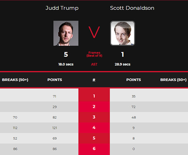 下半场特鲁姆普火力全开,第五局打出一杆52分,以69-8获胜4-1拿到赛点。第六局特鲁姆普再接再厉,单杆得到86分零封锁定胜局,连下四局以5-1轻松击败唐纳德森,顺利闯进四强。