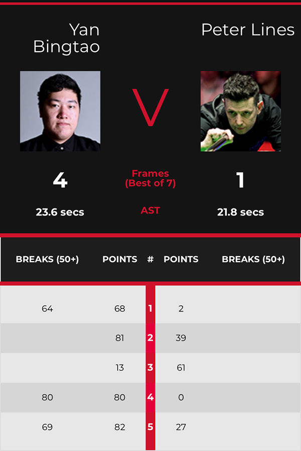 第五局,没有任何退路的莱恩斯反击无力,颜丙涛单杆69分锁定胜局,总比分4-1获胜晋级,祝贺颜丙涛!
