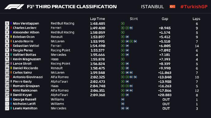 F1土耳其站FP3成绩表: