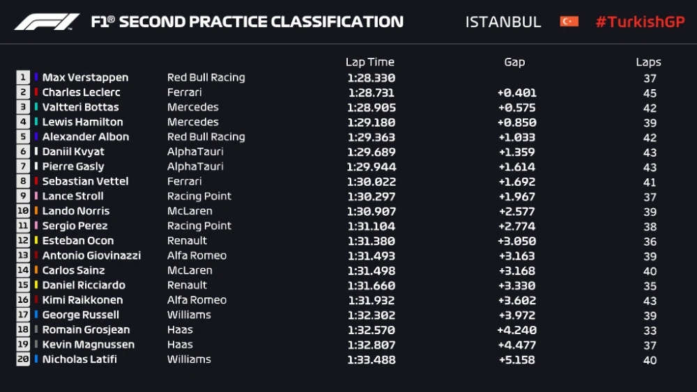 24直播网讯:北京时间11月14日,2020年F1土耳其大奖赛的第二节自由练习赛结束,红牛车手马克斯·维斯塔潘再次拿下最快圈速,领先于法拉利车手夏尔·勒克莱尔,而所有车手仍在低抓地力条件下挣扎着。