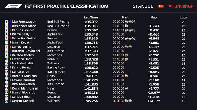 北京时间11月13日,2020年F1土耳其大奖赛在伊斯坦布尔公园赛道进行。维斯塔潘以1:35.077排名第一,阿尔本和勒克莱尔分列二三位。加斯利第4,维特尔第5,科维亚特第6,诺里斯第7,吉奥维纳兹第8,博塔斯第9,奥康第10。由于一练的赛道条件并不理想,所以很多车手频繁出现打滑,北京时间20点进行的二练会有更好的赛道条件让车手们刷出更快的圈速。