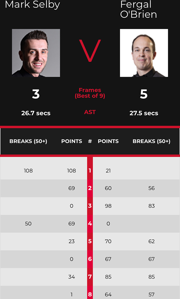比赛采用9局5胜制,比赛开始后,塞尔比马上进入状态,一杆108分压制对手,先拔头筹。第二局,奥布莱恩打出一杆56分,但即将超分时出现失误,塞尔比69-60逆转拿下这一局。第三局,奥布莱恩打出了流畅进攻,单杆83分零封塞尔比。第四局,塞尔比回敬一杆50分,同样零封对手。前四局结束,塞尔比3-1领先。