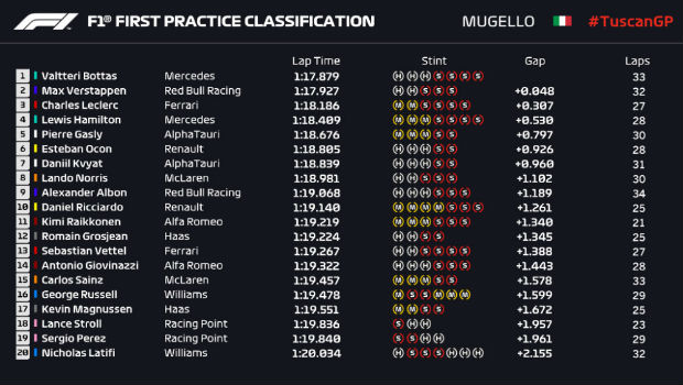 2020年F1托斯卡尼大奖赛第一次自由练习赛结束,奔驰车手瓦尔特里·博塔斯打破穆杰罗赛道记录,以1分17.879秒的成绩位居榜首,红牛车手马克斯·维斯塔潘仅以0.048秒之差紧随其后排在第二,而法拉利车手夏尔·勒克莱尔则出乎意料地排在了第三。