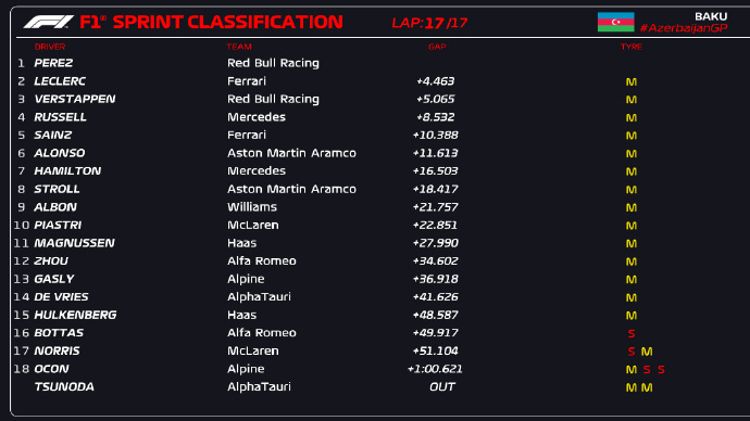 24直播网讯 2023年F1阿塞拜疆大奖赛冲刺赛,红牛车队的塞尔吉奥·佩雷兹取得冲刺赛胜利,收获8个积分!法拉利车队的勒克莱尔第二,维斯塔潘驾驶受损的赛车取得第三,排名第四至八位的车手分别是,拉塞尔、塞恩斯、阿隆索、汉密尔顿、斯托尔。冲刺赛前八名的车手将分别获得8-7-6-5-4-3-2-1分!