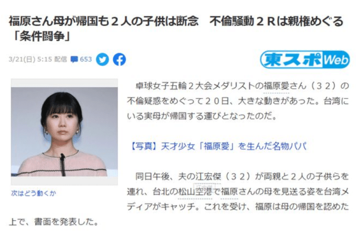 根据日本媒体的报道,如果婚姻最终破裂,孩子的抚养权归属将成为两人争夺的焦点。福原爱一直想把孩子带回日本,不过日本法律人士认为,福原爱在争夺抚养权问题上,处于被动。首先,争夺抚养权本来就是男方更加占据优势。其次,福原爱是自己丢下孩子回到日本,并且和丈夫之外的男子约会,从而引发了外界的关注。