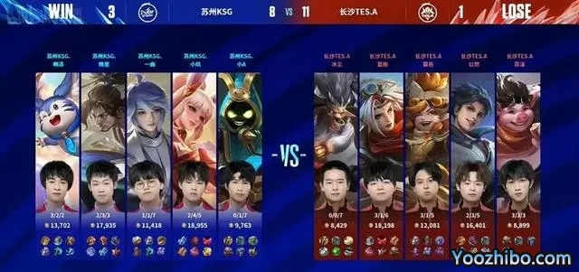 第三局,长沙TESA蓝色方,拿到了夏侯惇+黄忠。苏州KSG红色方,拿到了赵怀真+虞姬。开局苏州KSG击杀夏侯惇,拿下一血。5分钟,苏州KSG项羽一闪顶到三人,打出真一换三。9分钟,苏州KSG击杀黄忠,直推中路一塔。决胜团。苏州KSG点杀周瑜,连杀三人,直推水晶,拿下赛点。