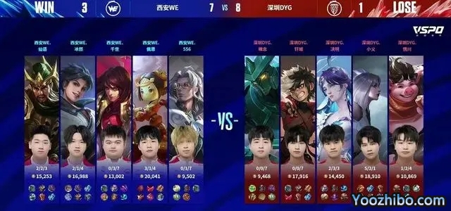 第一局,深圳DYG蓝色方,拿到了宫本武藏+公孙离。西安WE红色方,拿到了镜+戈娅。开局深圳DYG击杀镜,拿下一血。8分钟,西安WE击杀对面上野,直推中路一塔,经济差拉开七千。12分钟,西安WE控双控,项羽一闪控住三人,瞬秒公孙离,一波团灭深圳DYG,直推水晶,先下一局。