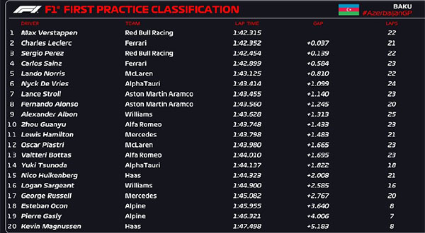 塞恩斯、汉密尔顿、阿隆索、诺里斯、角田裕毅、斯托尔和皮亚斯特里分列四至十位。中国车手周冠宇名列第16位。