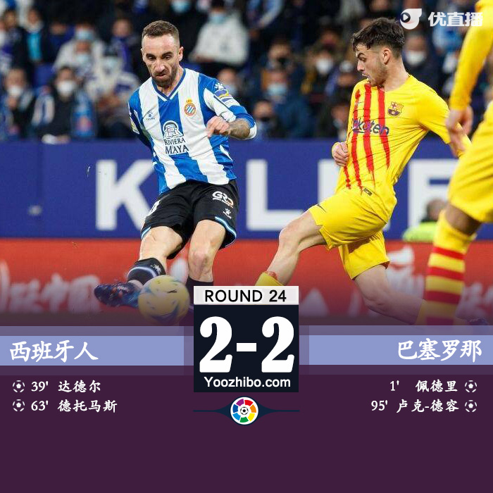 24直播网2月14日讯 北京时间2月14日04:00,西甲第24轮,西班牙人主场面对巴塞罗那。上半场比赛,佩德里开场进球,达德尔远射扳平。半场战罢,双方1-1战平。下半场比赛,德托马斯反超比分,武磊替补未登场,皮克补时染红,L-德容补时绝平。最终全场比赛结束,巴萨2-2西班牙人,积39分升至积分榜第四。