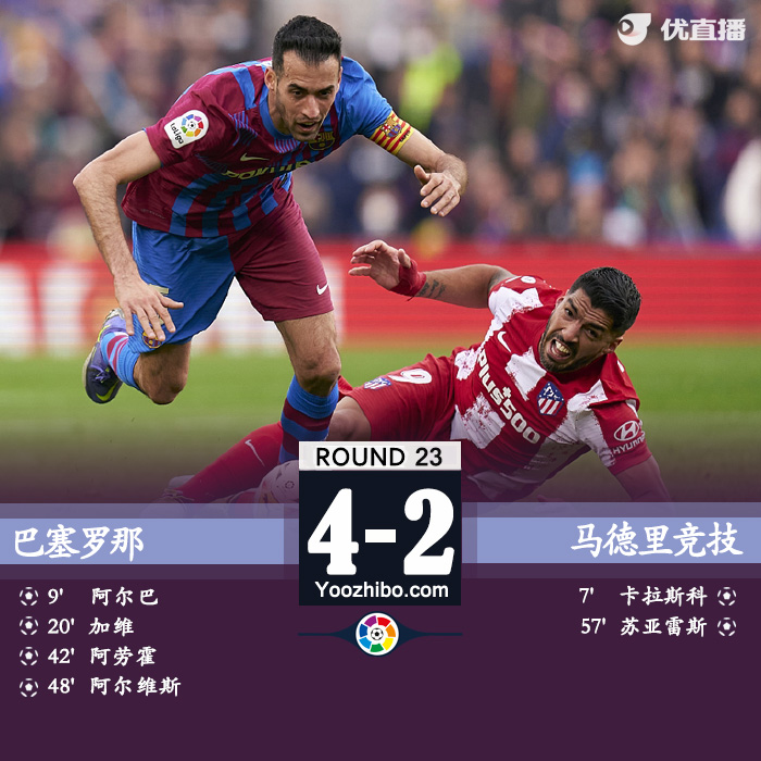 24直播网2月7日讯 北京时间2月6日23:15,西甲联赛第23轮巴萨主场迎战马竞的比赛。上半场卡拉斯科推射破门,阿尔巴凌空世界波扳平,加维头球反超,阿劳霍补射破门,半场巴萨3-1马竞。下半场易边再战,阿尔维斯破门后染红,苏亚雷斯为马竞扳回一球,最终,巴萨4-2马竞。