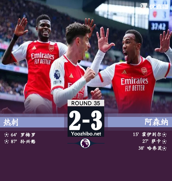 24直播网讯:北京时间4月28日晚21时整,2023-24赛季英超第35轮北伦敦德比在新托特纳姆热刺球场展开角逐,热刺坐镇主场迎战阿森纳,上半场萨卡破门+造霍伊别尔乌龙,哈弗茨传射&近2场3球,下半场拉亚失误送礼,赖斯送点,罗梅罗和孙兴慜连扳两球。最终阿森纳客场3-2险胜热刺,枪手取得联赛3连胜,热刺遭遇两连败。积分榜方面,枪手多赛2场以4分优势领跑,热刺位居第5,少赛2轮落后前四名7分。