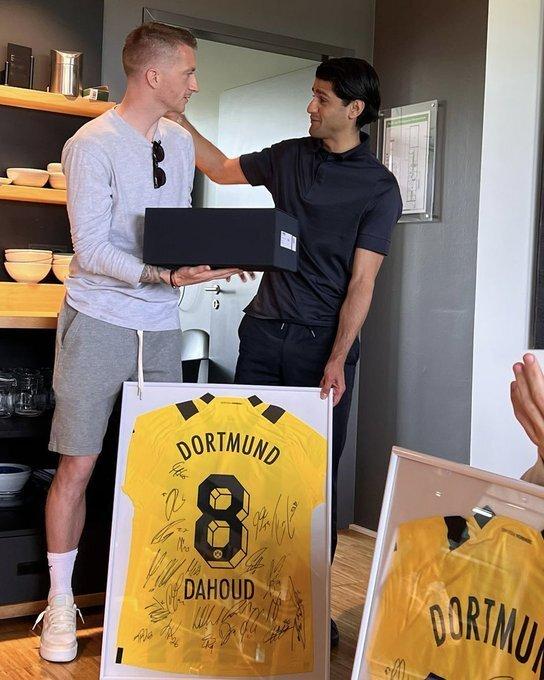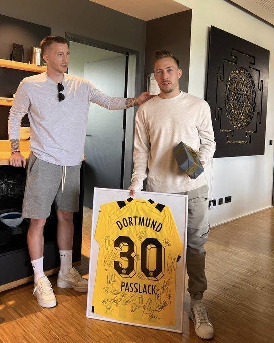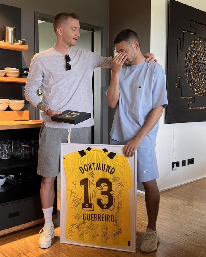 值得注意的是,多特蒙德官推还晒出了即将34岁的队长罗伊斯,为几位离队队友送别的感人照片。罗伊斯为这些队友送上印有全队签名的球衣挂画,还有纪念牌。而葡萄牙国脚格雷罗在告别仪式中已经伤心得泣不成声,罗伊斯也眼中含泪,这场面让人看得十分动容。
