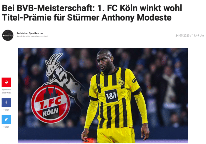 而这笔奖金的由来,要追溯到去年夏天莫德斯特的交易。去年夏窗,莫德斯特以500万欧转会费从科隆加盟多特蒙德。根据转会的条款约定,如果多特蒙德本赛季夺得联赛冠军,还需要追加支付给科隆一笔6位数的后续费用。正因为此,尽管本赛季科隆保级无忧、欧战无望,但为了这笔丰厚的奖金,他们还是会在客场全力狙击拜仁,阻扰卫冕冠军取胜实现德甲“11连冠”的伟业。