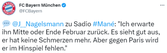 纳格尔斯曼表示,我期待他在2月中旬或下旬回归,他现在看起来不错,但无法赶上与巴黎的首回合比赛。